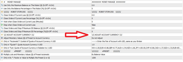 Preferably the account balance currency must be USD, if this is not possible, you will need to adjust my PRESETS to the account currency, as they are in USD. This is done in the “MONEY MANAGE” section, in “Adjust Monetary Values ($) of Preset to Account Currency”. There are three options for obtaining the quote between your account currency and USD, automatically, you can write the quote yourself or adjust using quote list.