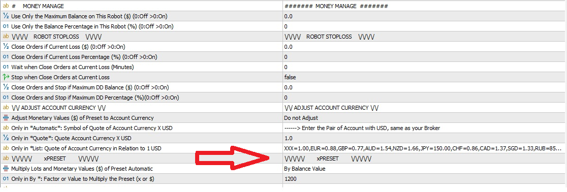 The xPRESET also needs to multiply the PRESET “Monetary Values” to maintain the same Risk/Return ratio as the balance increases. This is necessary because there are protections and calculations that use the account balance and drawdown. If these PRESET values are not multiplied, the strategy would become disproportionate with the increase in lots alone. The idea is that in an account with a balance 10 times greater than the recommended balance, the profit and drawdown will be exactly 10 times greater.