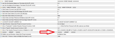 In the “By Balance Value” or “By Equity Value” option: xPRESET will be the division of the balance or equity by the recommended balance specified by the variable “Only in By *: Factor or Value to Multiply the Preset (x or $)”, with the value of this variable being the recommended balance for the PRESET, since each time the account balance or equity is greater than the multiple of this balance recommended, the xPRESET will be multiplied. The result of the division between the account balance or equity by the value of the variable will be rounded down. The account balance or equity used for this calculation is the balance that was defined for use by the robot.
