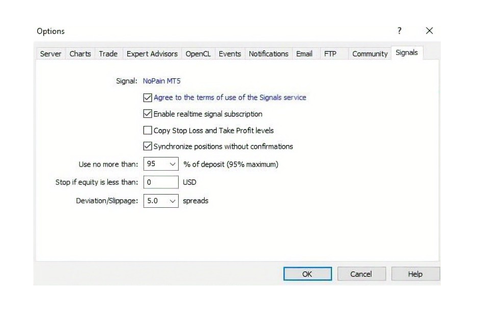 On MetaTrader, configure the Signals tab as shown in the image below. It is important to increase the Deviation/Slippage value so that trades are not blocked when your spread is high.